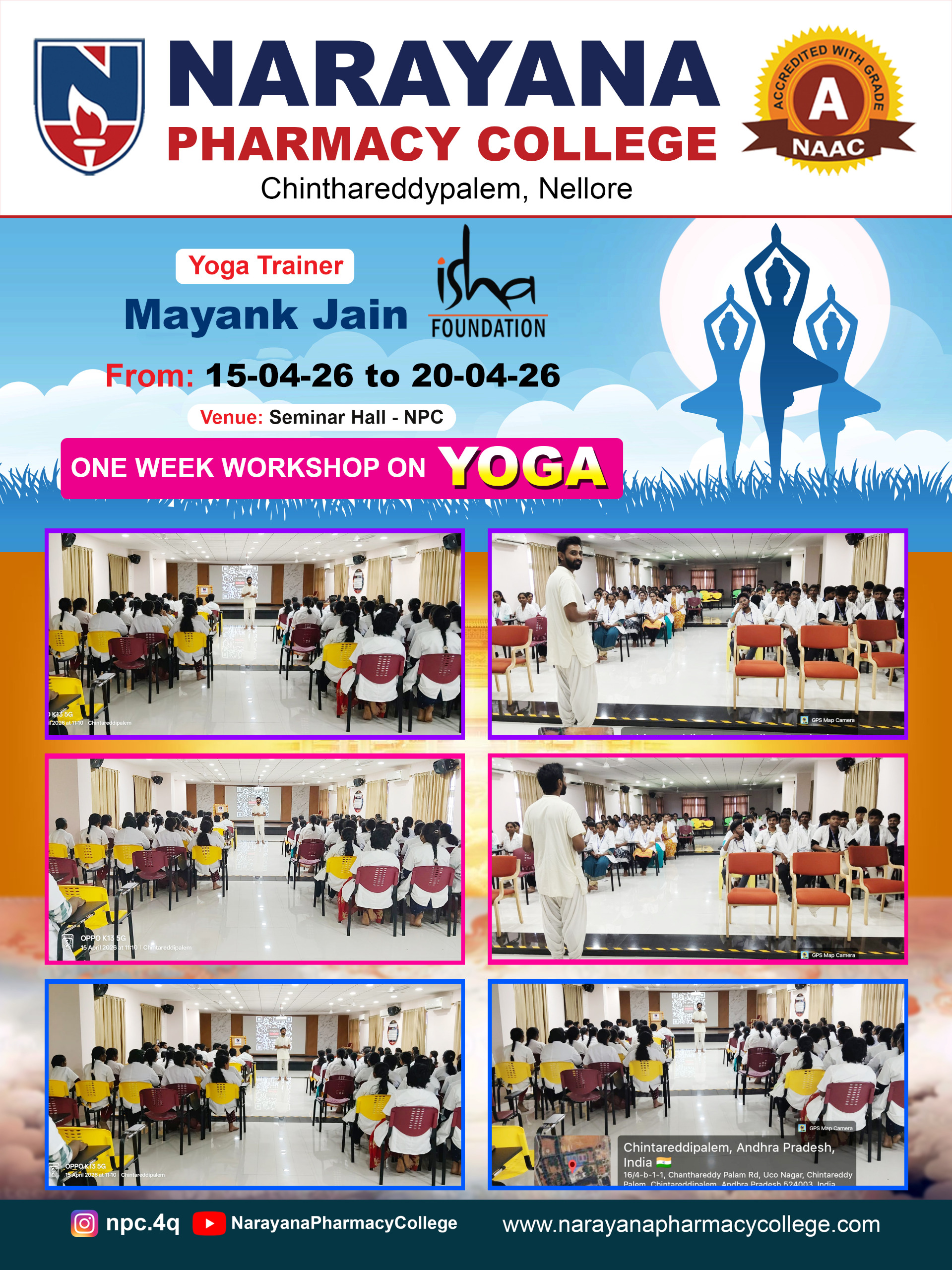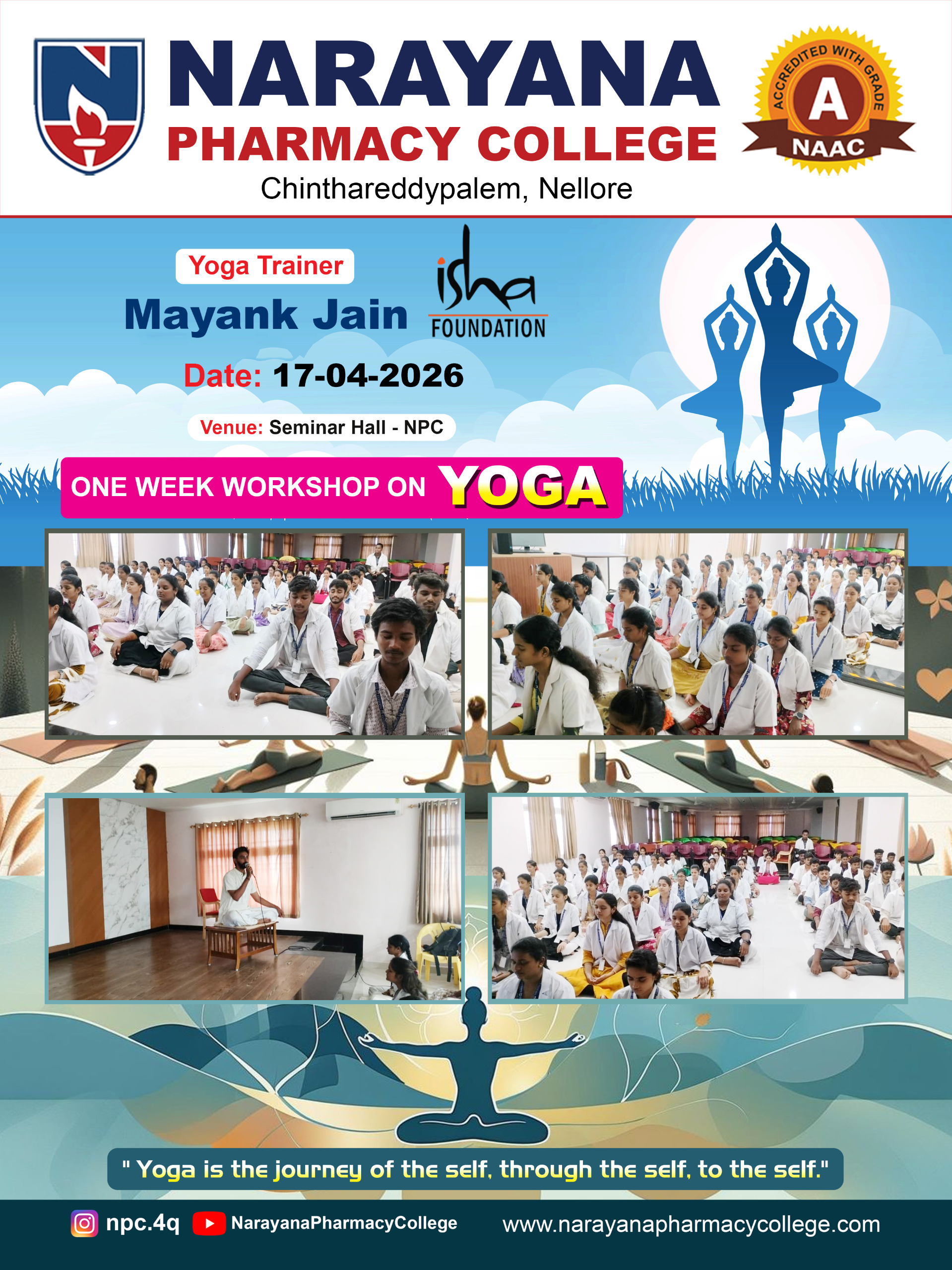 Narayana Pharmacy College is hosting a one-week yoga workshop from 15 April to 20 April 2026 in its seminar hall. The program is specially organized for students to promote physical fitness, mental well-being, and a balanced lifestyle. The sessions are conducted by Mayank Jain from the Isha Foundation, who brings expertise in yogic practices and holistic health. Throughout the workshop, participants will learn various yoga techniques, breathing exercises, and relaxation methods. This initiative aims to encourage students to adopt healthy habits and manage stress effectively while enhancing their overall concentration, energy levels, and personal well-being.
